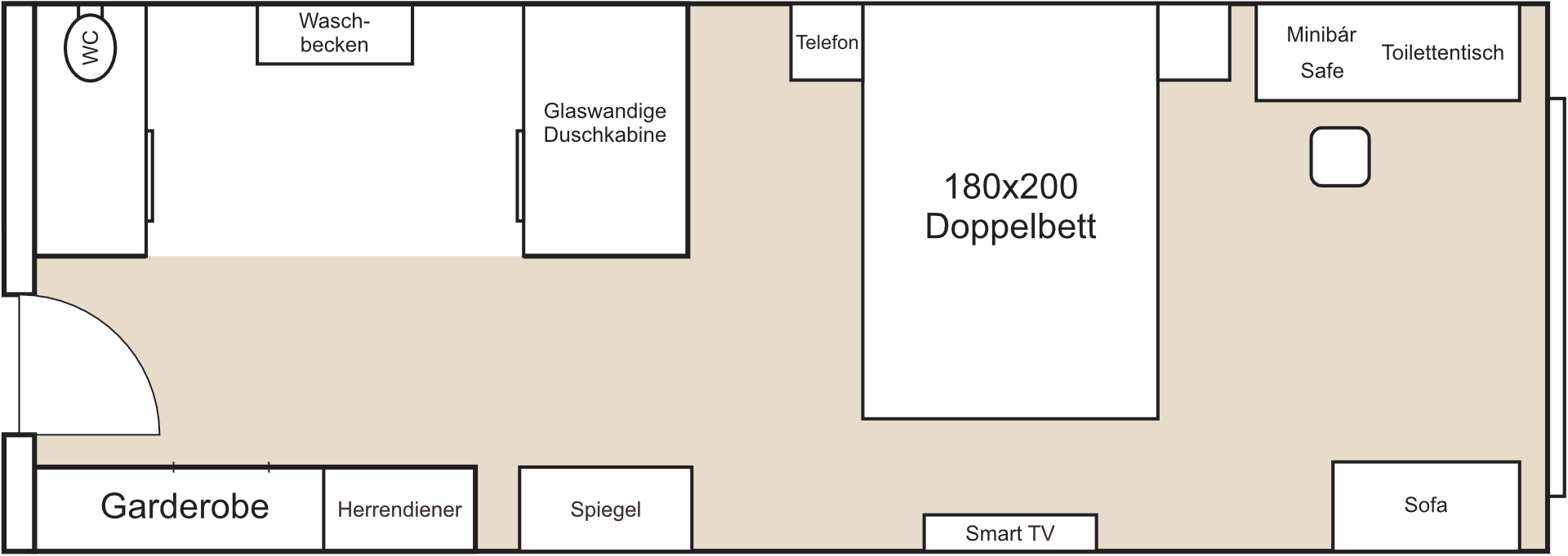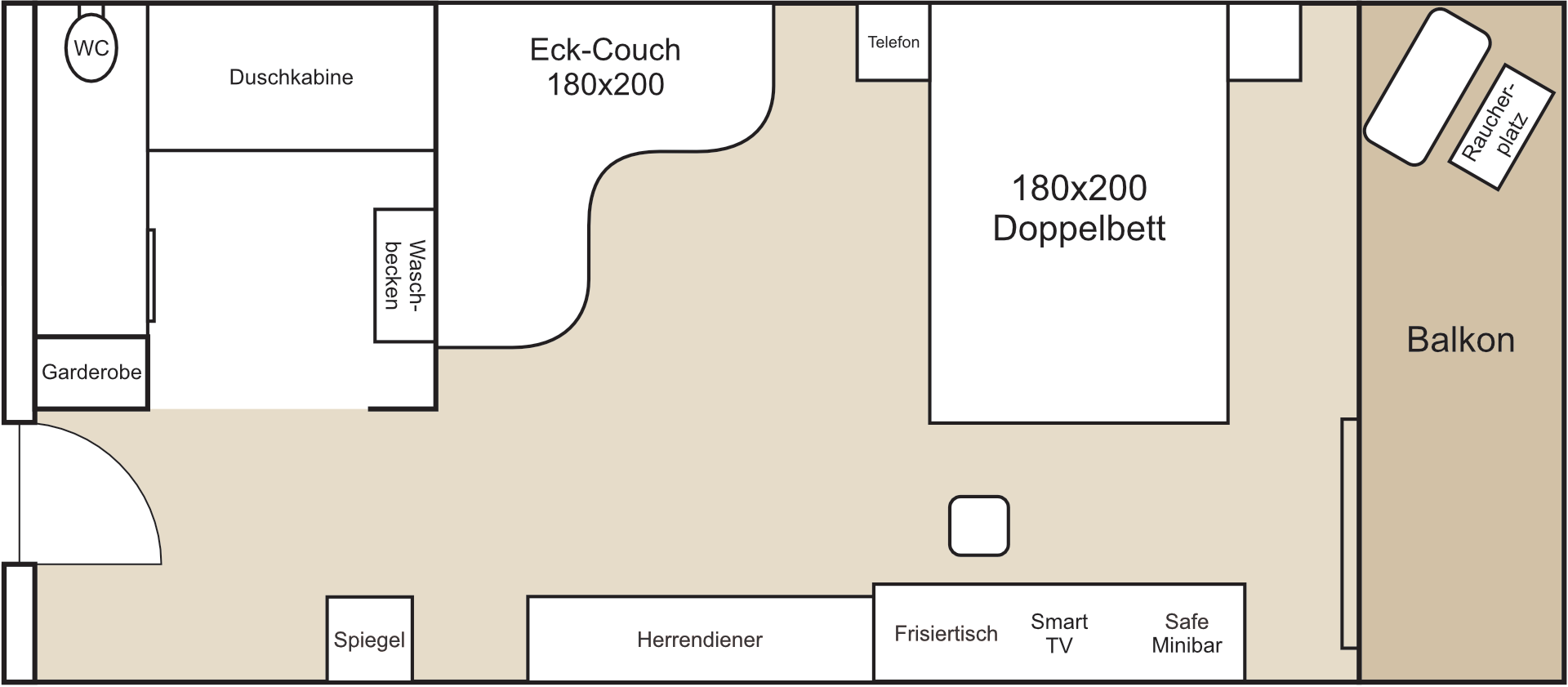 Die Zimmer sind ausgestattet mit einem 180 × 200 cm großen Doppelbett mit Memoryschaum-Matratze und hochwertiger Bettwäsche (1 Stück 240 × 190 cm große, gemeinsame Steppdecke sowie 2 Kissen pro Person), einer Eckcouch (ausziehbar zu einem 180 × 210 cm großen Zustellbett), Telefon, WLAN, großem Smart-TV, Safe mit Touchpanel, digitaler Informationsmappe (QR-Code), DND-Panel, gefüllter Minibar, individuell regulierbarer Klimaanlage, Walk-in-Dusche, separatem WC, Haartrockner, vorbereiteten Handtüchern, Bademantel, Wellness-Handtuch sowie einem Zweisitzer-Sofa auf dem Balkon. Die Zimmer sind mit dem Aufzug erreichbar und bieten Blick auf den Pool und die Rasenfläche.